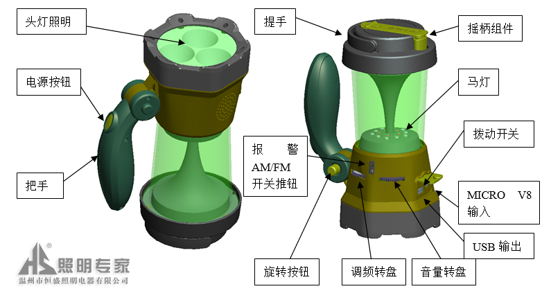 救災多功能應急燈通過手搖發電原理,用手搖動搖柄,經內部傳動機構變速後,帶動應急燈內(nèi)置電(diàn)機(jī)發出交流電(diàn),再經整流穩(wěn)壓後轉換為直流電,對內置電池(chí)充電,達到能量轉換並儲能(néng)的目的;采(cǎi)用集成電(diàn)路芯片,由三檔撥動(dòng)開關切換報(bào)警功能和(hé)頻段:FM-AM(調頻-調幅),頻率(lǜ)及音量手動旋鈕調諧,收音為手動(dòng)搜索選(xuǎn)台方式:選擇你喜歡頻道率收聽;救災多功能(néng)應(yīng)急(jí)燈還具有照明、手搖對電池及數碼類產品充電功能。