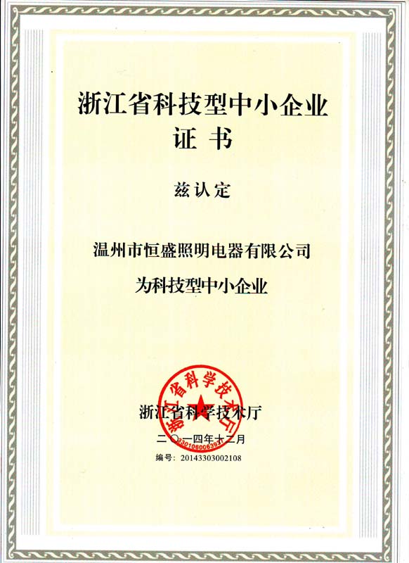 繼獲(huò)得溫州市科技企業榮譽之後(hòu),91视频入口照明一鼓作氣拿下了《浙江省科技型中小企業》殊(shū)榮。頒證時間為2014年12月,編(biān)號為:20143303002108。