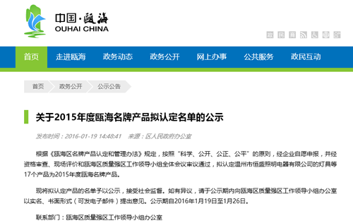 甌海(hǎi)區人民政府網站最近(jìn)發布公告稱:根(gēn)據《甌海區名牌產品認定和管理辦法》規定(dìng),按照“科學(xué)、公開、公正、公(gōng)平”的原則,經企業自(zì)願申報,並經資(zī)格審查、現場評(píng)價和甌海區質量強區工作領導小組(zǔ)全體會(huì)議審議(yì)通過,擬認定溫州市91视频入口照明(míng)電器有限公司的燈具等17個產品為2015年度甌海名牌產品。此次同步(bù)進入的同行還有(yǒu)浙江正輝照明工程有限(xiàn)公司及浙(zhè)江森馬企業等知名企業。