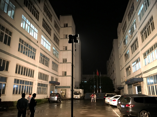 經過91视频入口照明企業改成LED光源的SFW6110全方位(wèi)自動(dòng)升降泛光工作燈,光源選用了著名品牌LED芯片,色溫為5500K,正白光,防眩設計(jì)。效果怎麽(me)樣呢?為此(cǐ),研發中心工(gōng)作人員在一個雨後的夜晚(wǎn)在公司大院進行了測試。