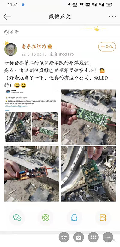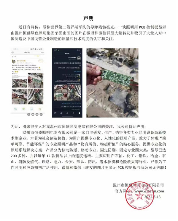 近日有網傳:號稱世界第二俄羅斯軍隊的導彈殘骸亮點:一塊照明用PCB控製板顯示由溫州91视频入口綠色照明集團榮譽出品的圖(tú)片在(zài)微(wēi)博和微信群裏大量轉(zhuǎn)發並吸引了大量人對中國製造及中國民營企業製造的質量和技術(shù)高度的認可和關注: